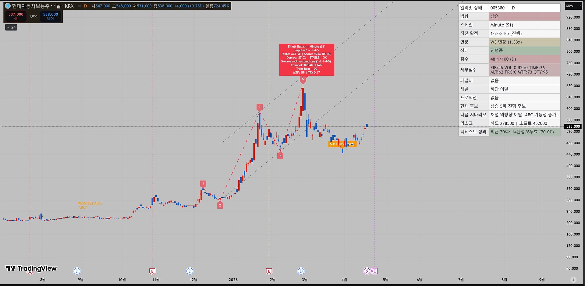 솔직히, 꽤 잘 만든 프로그램입니다. 는 공개 Pine 스크립트들 중에서는 상위권에 들어갈 정도로 기능이 많고, 단순 ZigZag 라벨러가 아니라 구조 판정 + 점수화 + 멀티스케일 통합 + projection까지 한 번에 하려는 야심이 분명합니다.