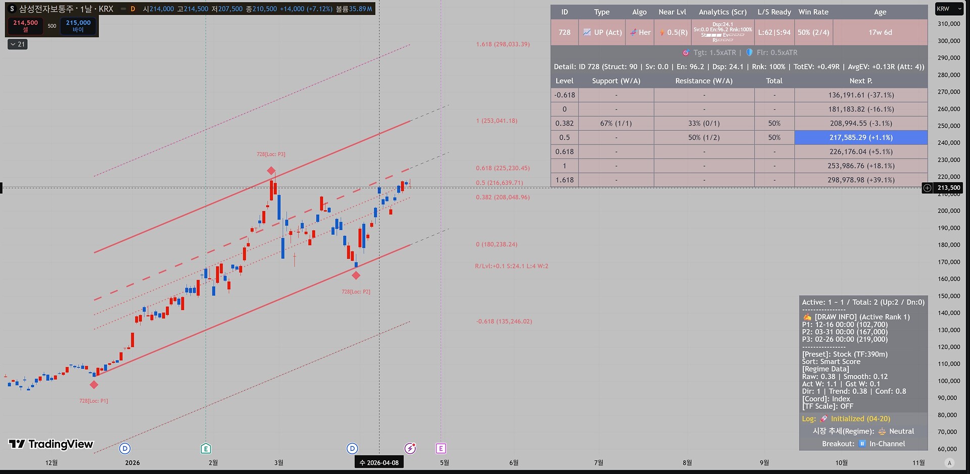 4,785줄짜리 Pine Script v6 코드를 전체적으로 훑어봤습니다. 한 줄로 요약하면 — 피벗 기반 자동 피보나치 채널 탐지 + 다목적 점수화 + 레짐 판정을 하나의 인디케이터에 몰아넣은, 대단히 야심찬 설계입니다. 핵심 파이프라인은 이렇게 돌아갑니다.