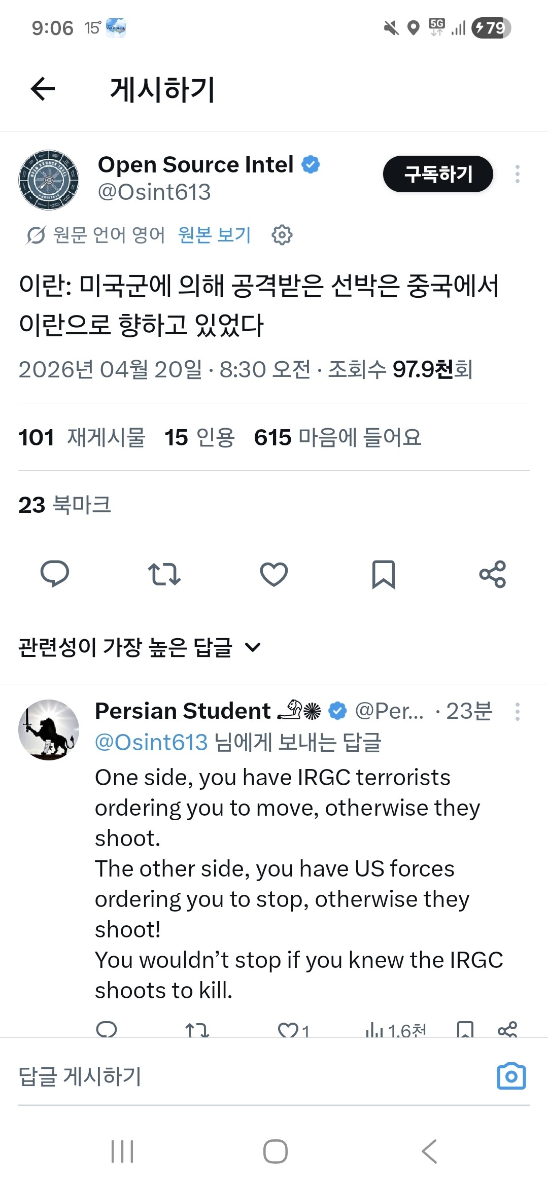 이란:미국에 의해 공격받은 선박은 중국-이란으로 향하는 배엿다