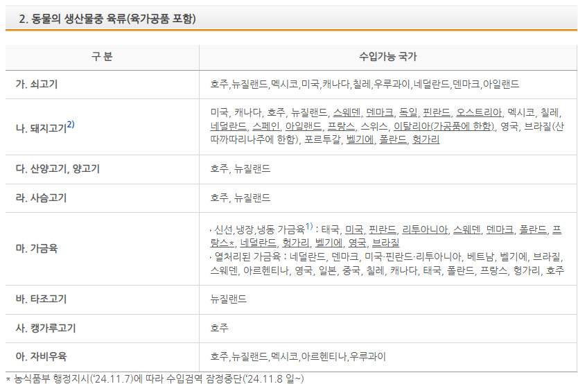 농림축산부 농림축산검역본부에서는 법률과 지침으로 육가공품류를 한국에 수입할 수 있는 나라가 정해져있어요