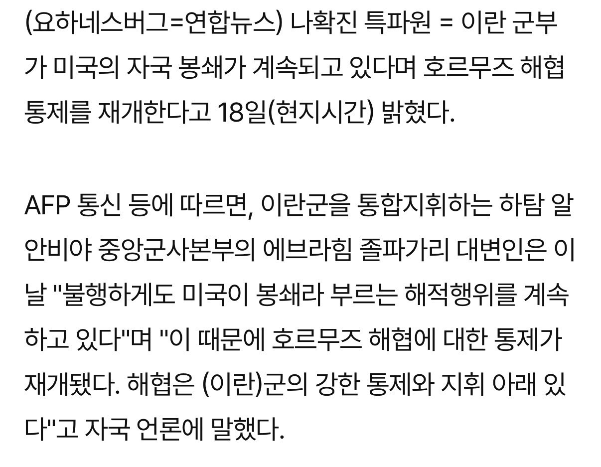이란군 "미군 봉쇄 유지로 호르무즈 해협 통제 재개"