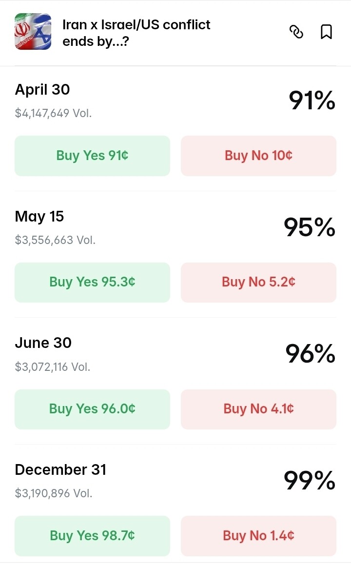 폴리마켓에서는 미국 이스라엘과 이란의 전쟁이 사실상 조만간 끝난다고 확정짓는 모양새네요. 이제 유가도 안정되고 전쟁도 마무리가 되니 확실히 근심할게 없어졌네요. 이제는 딱히 악재도 없으니 미국이든 한국이든 주가도 더 잘 갈일만 남았네요.