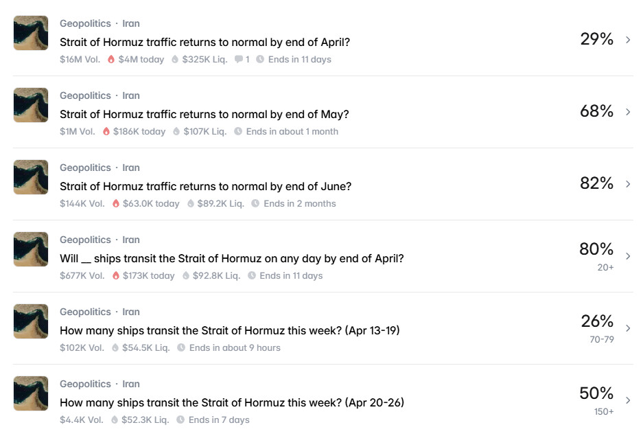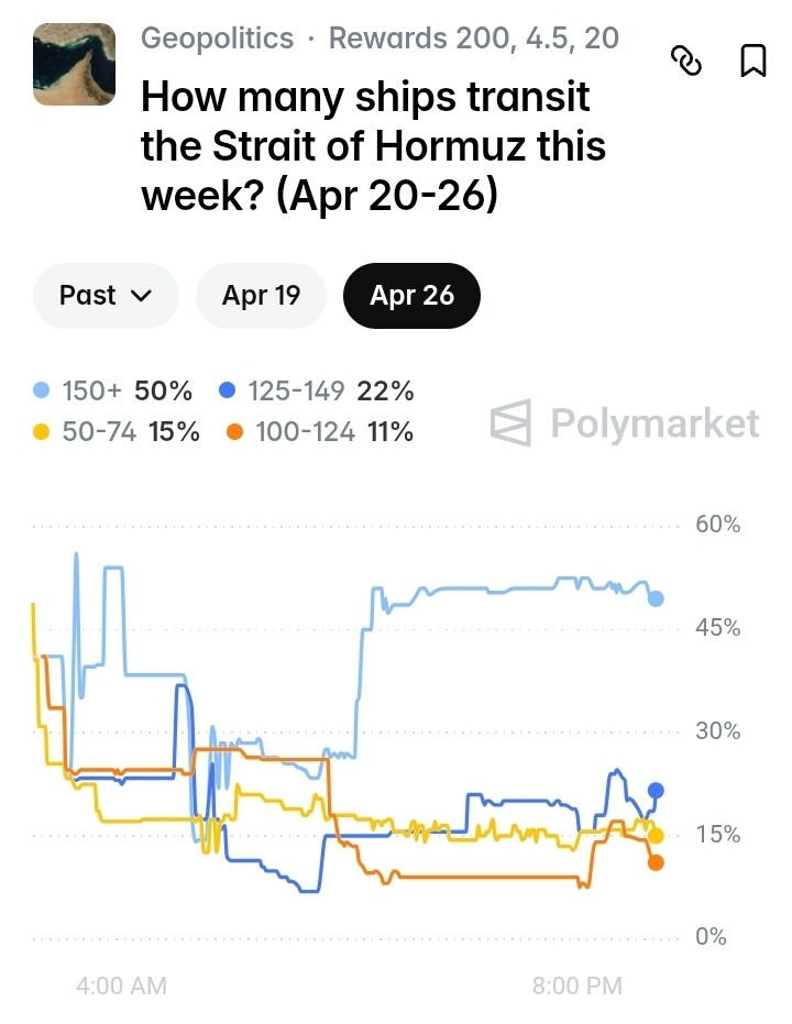 뉴스에서 볼 때는 마치 당장이라도 호르무즈해협이 봉쇄될거 같은데 폴리마켓 사이트에서는 정상적으로 배들이 운행할거라 믿는 사람들이 훨씬 많네요. 무슨 근거로 지금 모든 문제들이 해결이 되고 정상적으로 배들이 호르무즈 해협을 통과한다고 생각하는 걸까요. 그에 대한 이유를 모르니 왠지 갑갑하네요. 혹시 여러분들의 생각이 궁금하네요.
