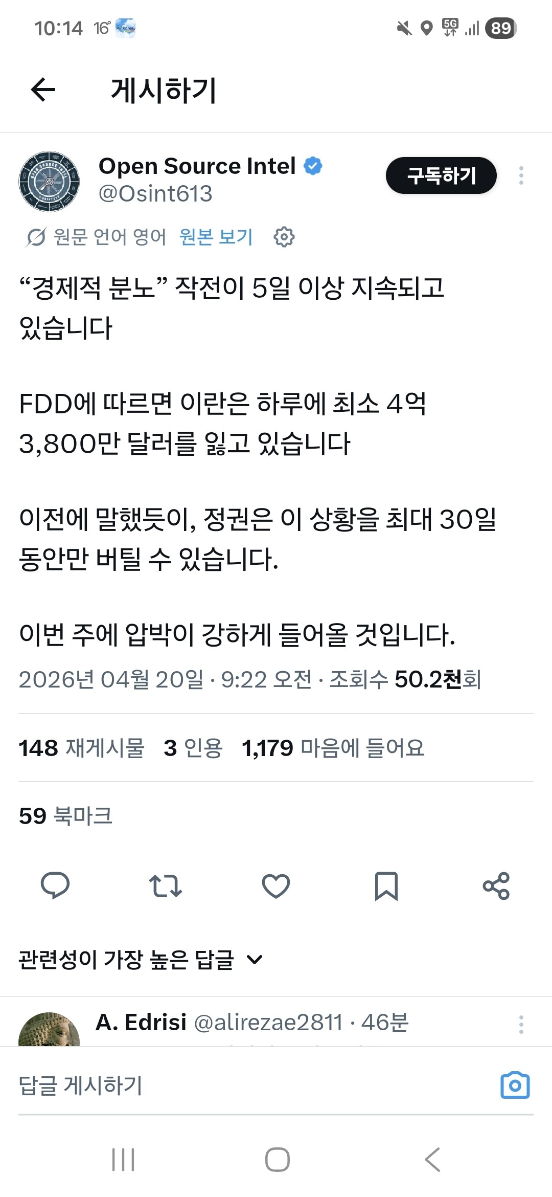 이란은 하루에 4억달러이상을 읺고있다